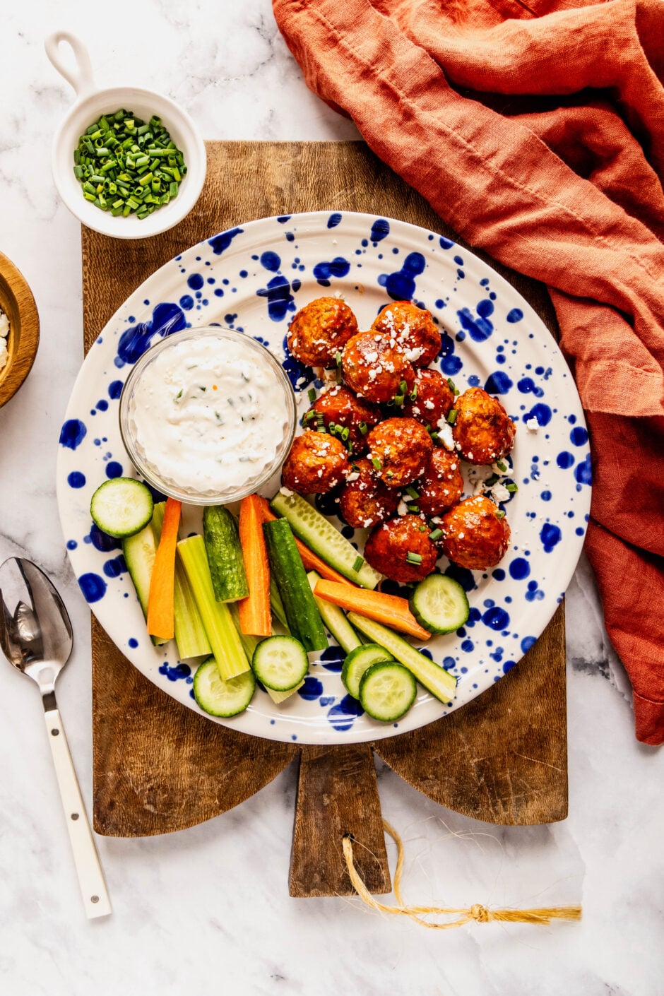 For effortless hosting, transfer the meatballs to a slow cooker set to warm and keep them coated in buffalo sauce throughout the party. Add toothpicks, celery sticks, and a side of blue cheese or ranch dressing so guests can help themselves.