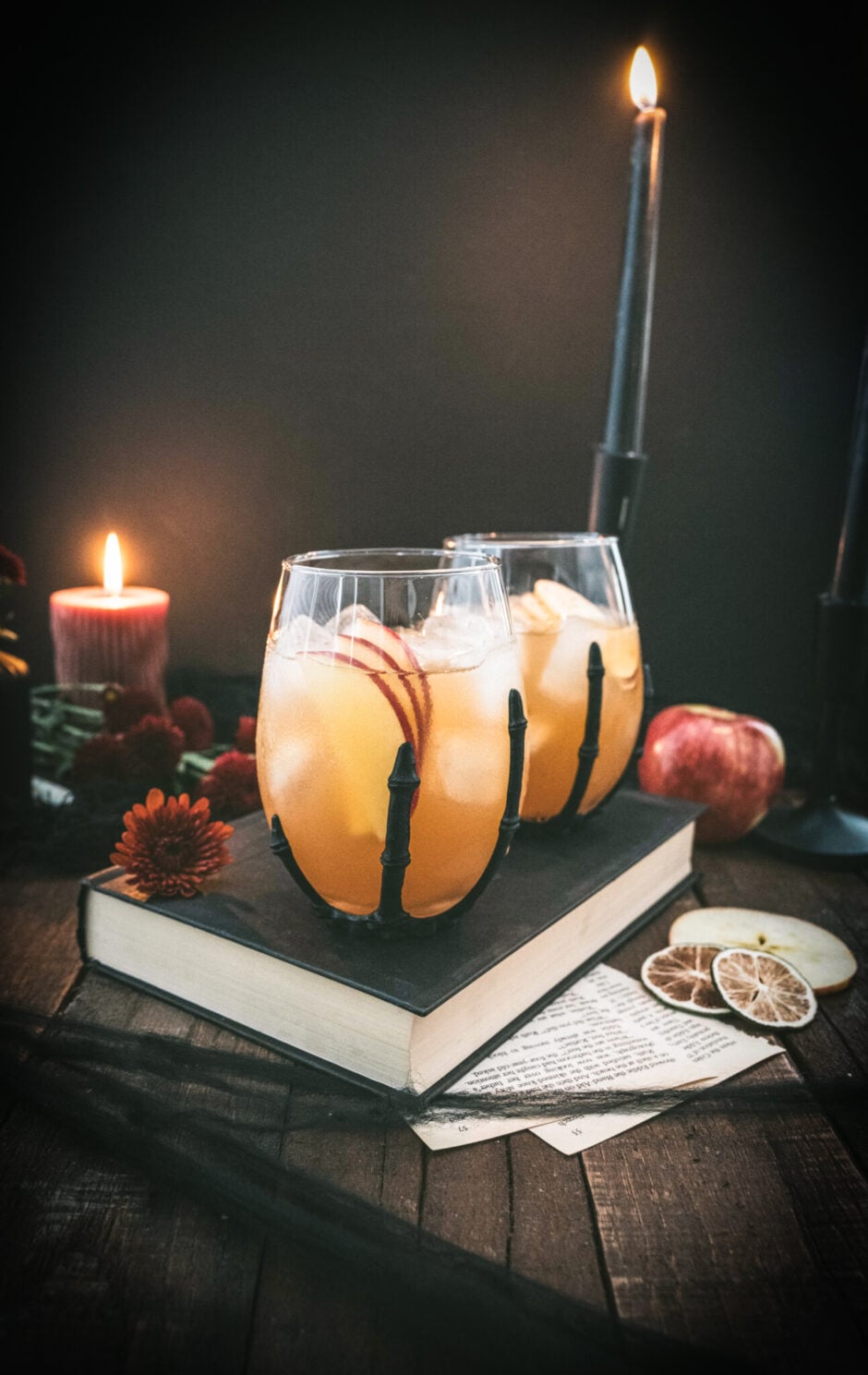 Stir or shake to chill the drink. Pour into spooky glasses over ice or straight in a coupe glass and garnish with apple slices, cinnamon sticks, or a sprinkle of pumpkin pie spice.