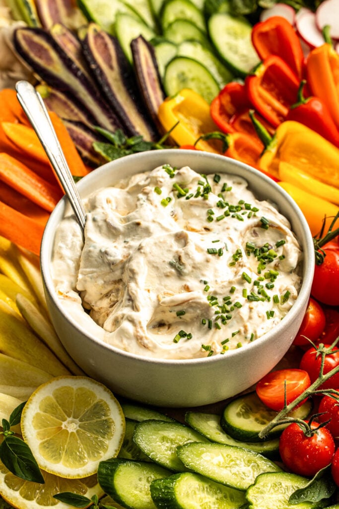 Sour Cream and Onion Dip – made with rich, tangy, savory, and layered with deeply caramelized onions, a hint of garlic, and a fresh bite of chives. This is one of those dipping sauces that will always have you coming back for more!